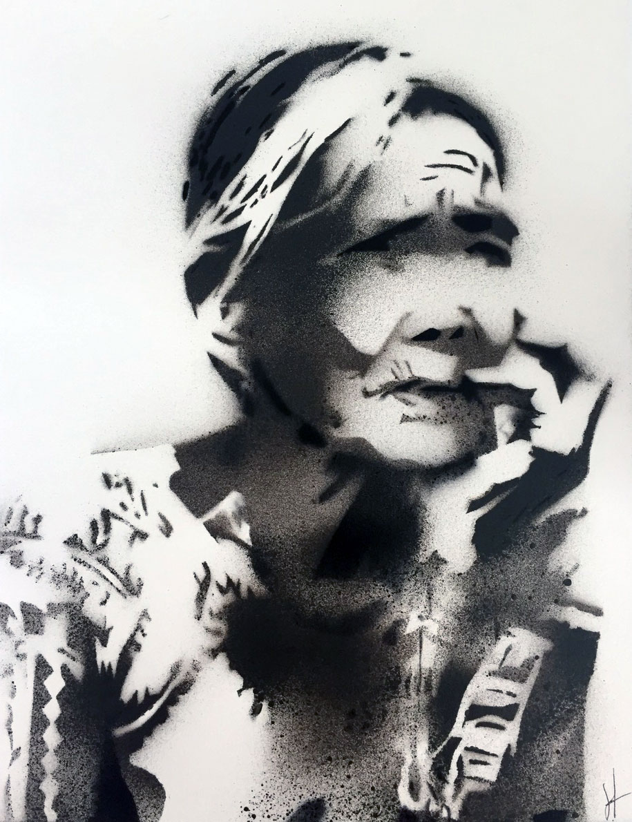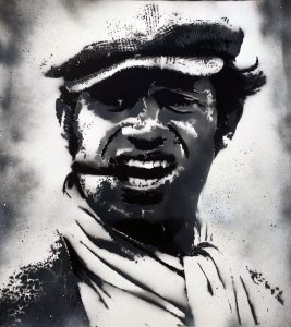 L’utilisation des sprays ajoute une énergie vibrante, insufflant une nouvelle vie à ces légendes tout en conservant leur intemporalité. Mon travail explore ainsi le lien entre mémoire collective et émotion artistique, recréant des portraits qui résonnent avec le présent.